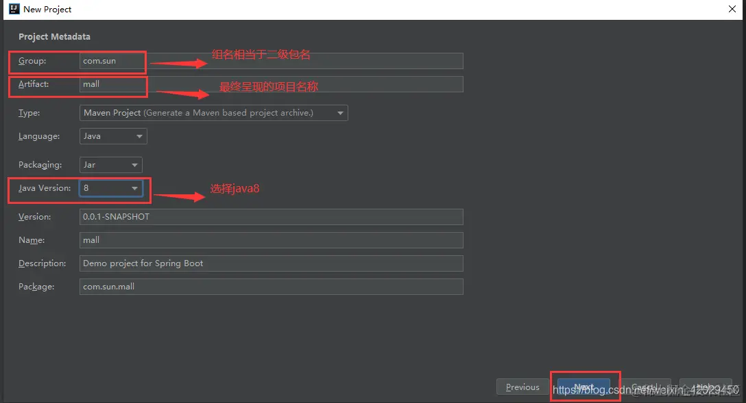 3.修改项目信息:Group:组名可不做修改(可以根据自己项目情况修改) 例如:标识性 com.自己名字缩写 ;Artifact:此处修改关系着项目名,点击下一步Next