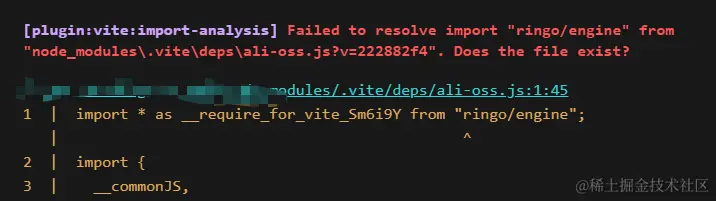 项目中,使用到 ali-oss 文件上传功能,打开页面报错 Failed to resolve import "ringo/engine" from "node_modules\.vite\deps\ali-oss.js"