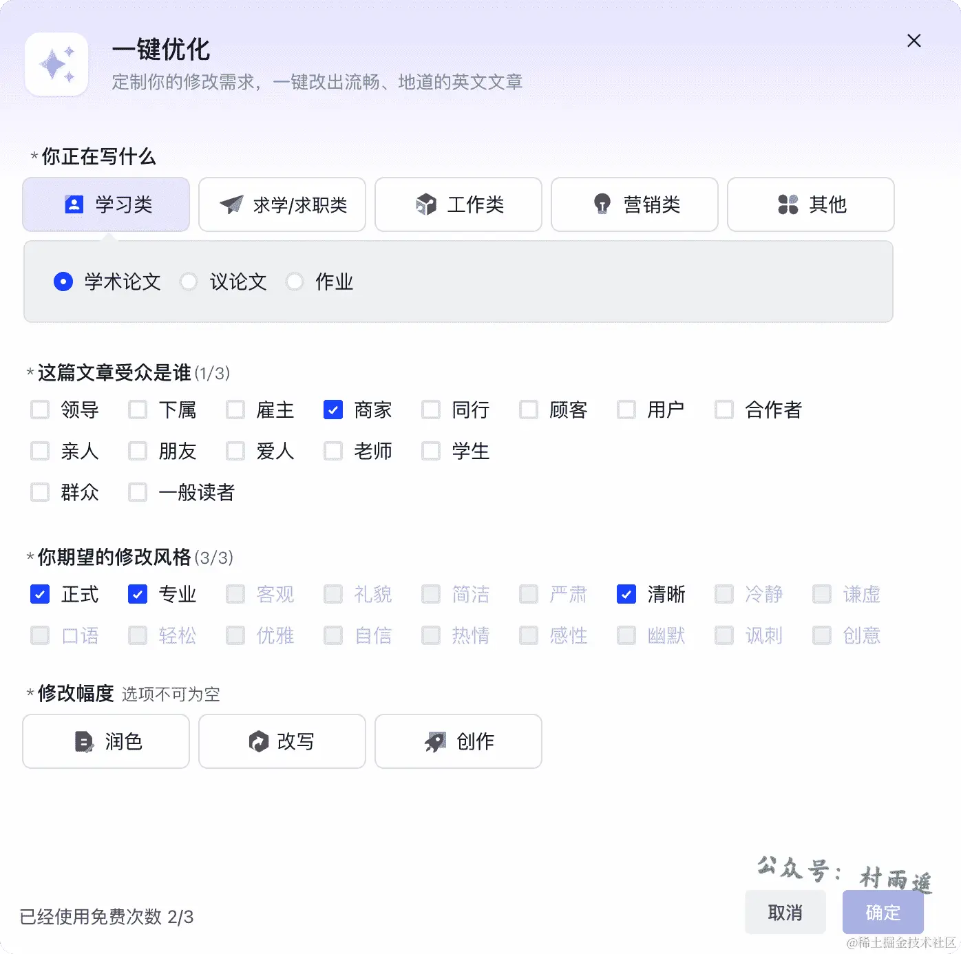 支持学术论文、邮件、用户手册、个人陈述、学校申请、活动通知等类型的文章。点击一键优化还能让你选择目前在写作的文章类型、文章受众、修改风格、修改篇幅等类型,从而实现更精确的改写。目前,不登录情况下限制免费使用 3 次,有需要的小伙伴可以去试一下效果!