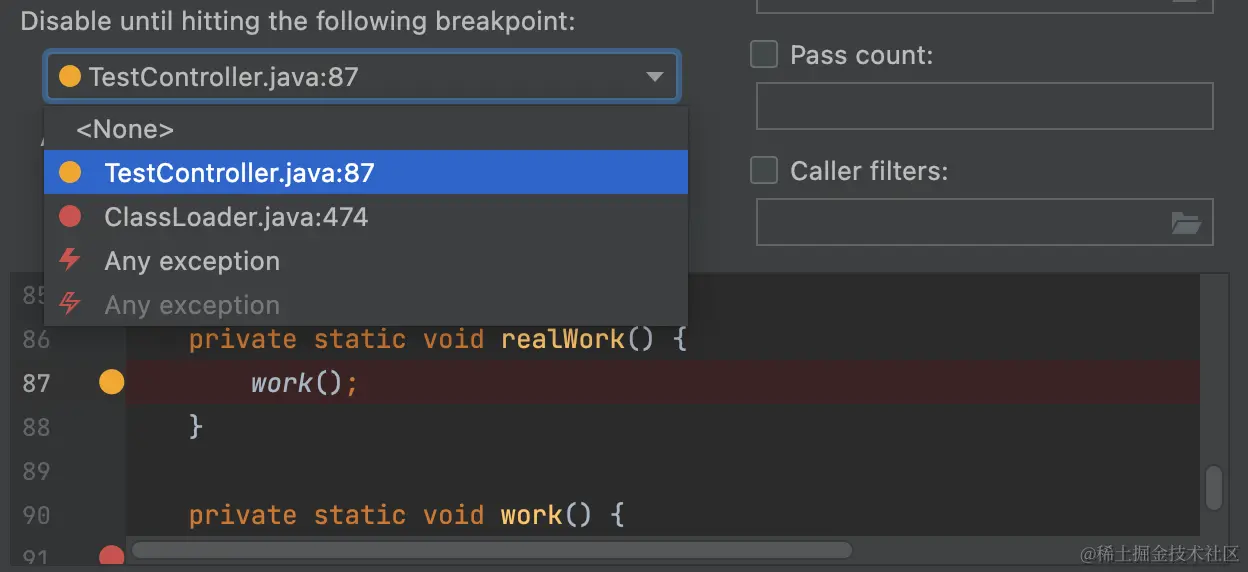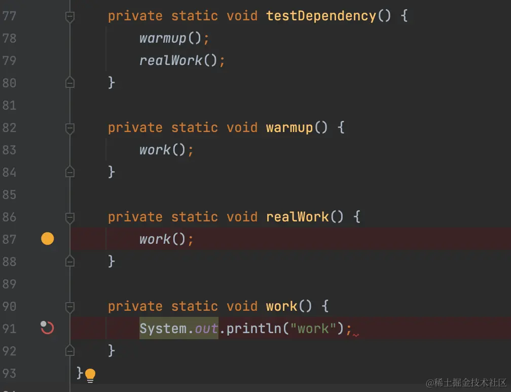 有时,目标方法可能被多个方法调用,例如以下代码,work()方法同时被warmup和realWork方法调用。如果我们只想在realWork方法执行的时候进行debug,那么就可以使用依赖断点功能。