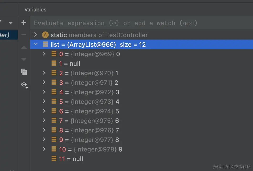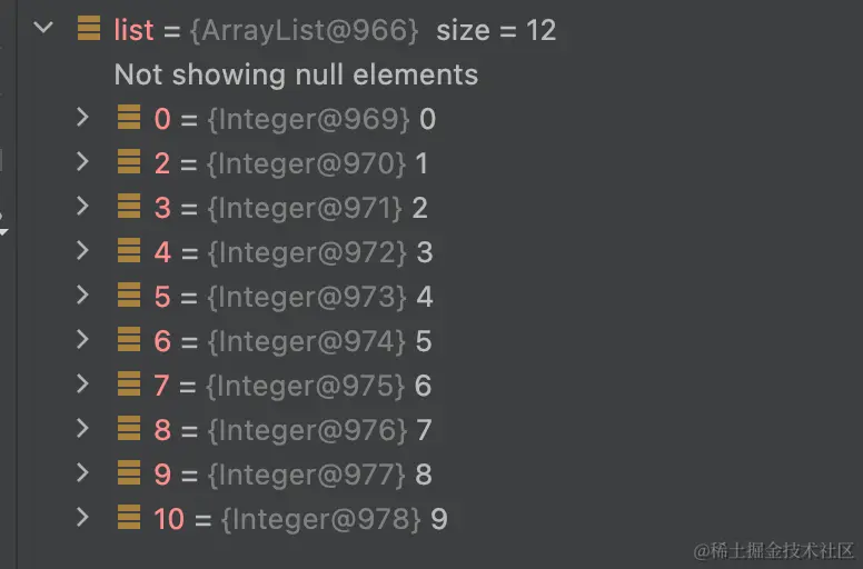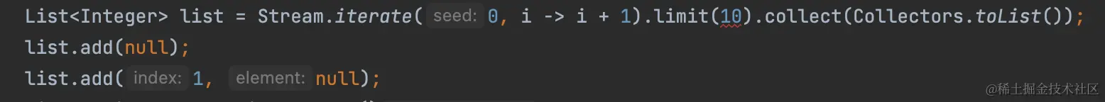 可以看到,IDEA并没有渲染为null的元素,如果我们没有注意,并在接下来遍历这个list,很可能会产生NPE。