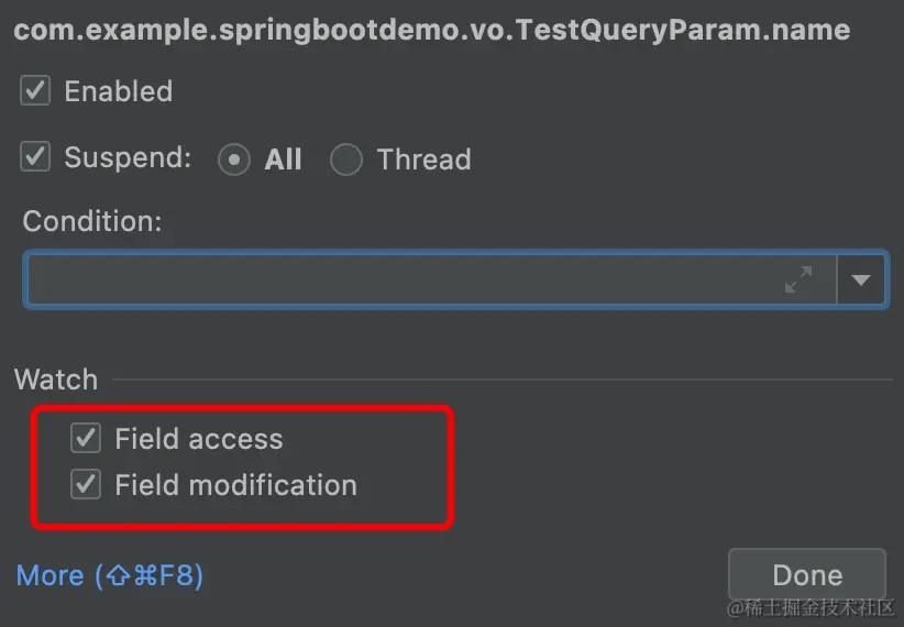 如果只用行断点的话,需要找到字段可能被使用或修改的每一行进行断点,而设置了字段观察点可以不用关心哪些行会修改字段,当它被使用或修改的时候自然会停下来。