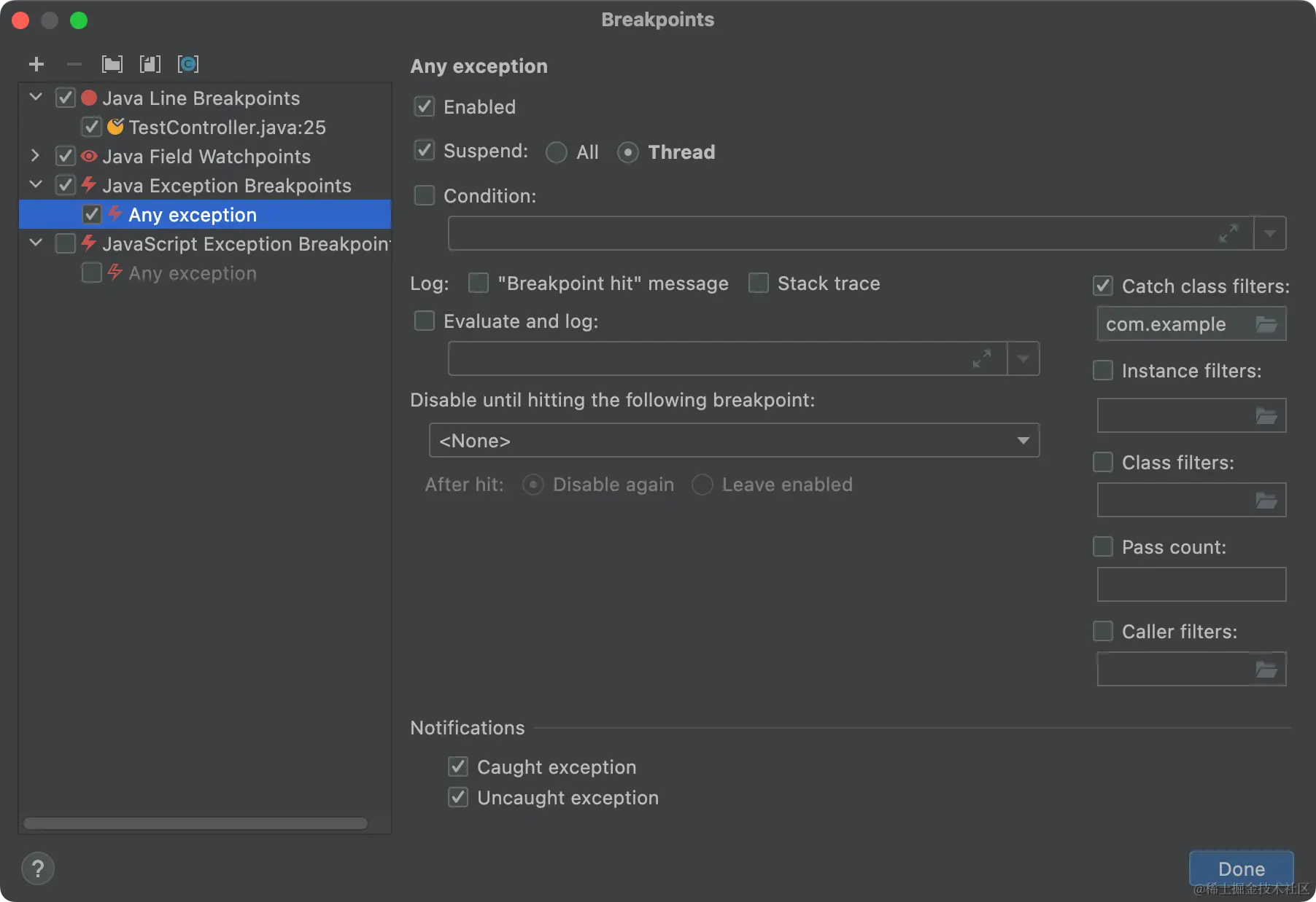 异常断点是无需在具体的代码上打断点的,而是在断点详情页中直接添加,后续在执行时,如果抛出我们监听的异常,则会自动暂停在抛出异常的地方。