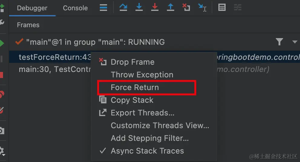 当我们调试时,发现继续往下执行就要将错误的数据写入数据库时,我们可以通过 Force Return 来强行结束当前流程。