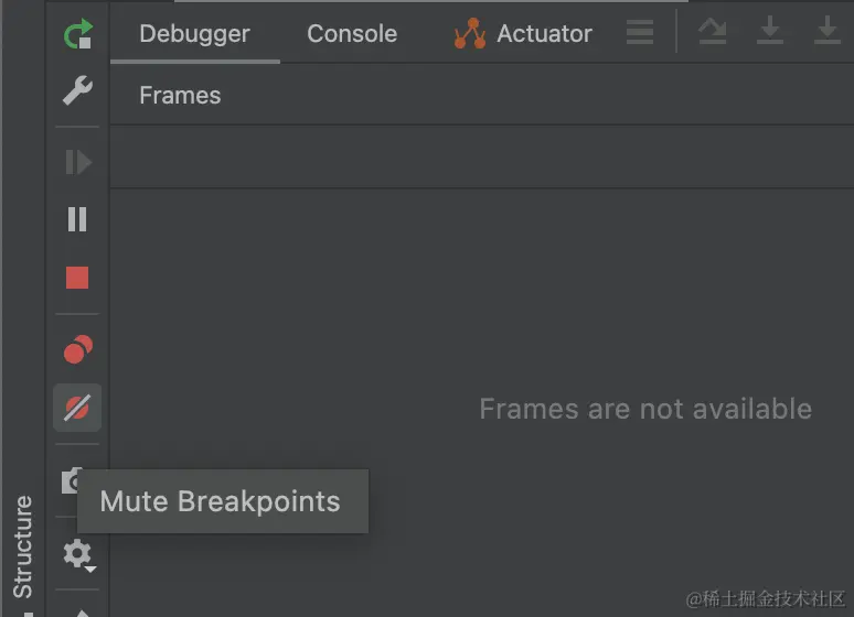 功能:在调试的时候可能不需要运行后面的断点了,这个时候使用静音断点,就可以将所有断点静音,然后正常运行完整个流程查看输出的结果