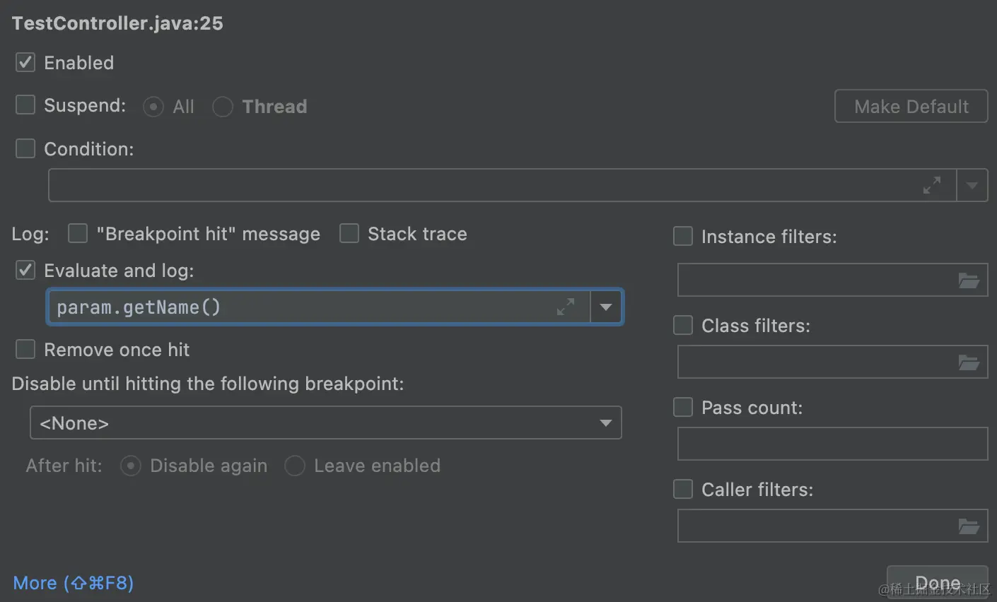 我们在创建断点时,进入断点配置界面后取消勾选Suspend,并填写Evaluate and log,此时,断点将会变为黄色。