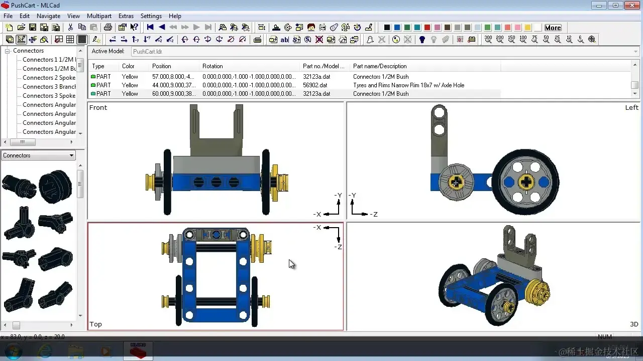 - 功能强大:MLCAD软件是目前所有的乐高CAD软件中功能最为强大的一个,上面就是MLCAD软件的窗口,在该软件的窗口上有4个视窗,可以生成模型的三视图(主视图、左视图、俯视图)和立体视图,因此在进行仿真搭建的时候,可以很精确的控制每个零件的位置,准确的将零件放到模型的任何位置。