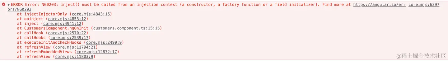 如果在上述五种上下文之外使用 inject 函数是不可以的,比如在 ngOnInit 钩子使用: