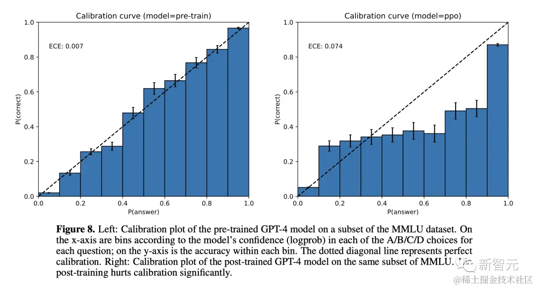 GPT-4 模型的校准图:比较预训练和后 RLHF 版本的置信度和准确性