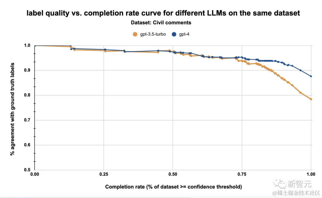 从上图可以看到在所有数据集中,GPT-4 的平均完成率最高,在 8 个数据集中,有 3 个数据集的标注质量超过了这一质量阈值。