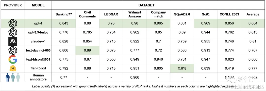 表 3:各种 NLP 任务中的标签质量(与基准真相的一致率),每列中的最高数字以绿色标出