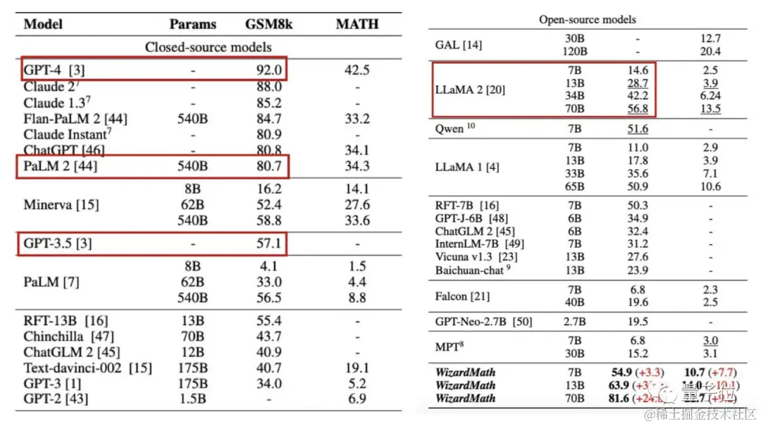 这个成绩,比目前最强数学垂域开源模型的 WizardMath-70B 低了 1.6%,与 ChatGPT、540B 参数的 PaLM-2 几乎持平。