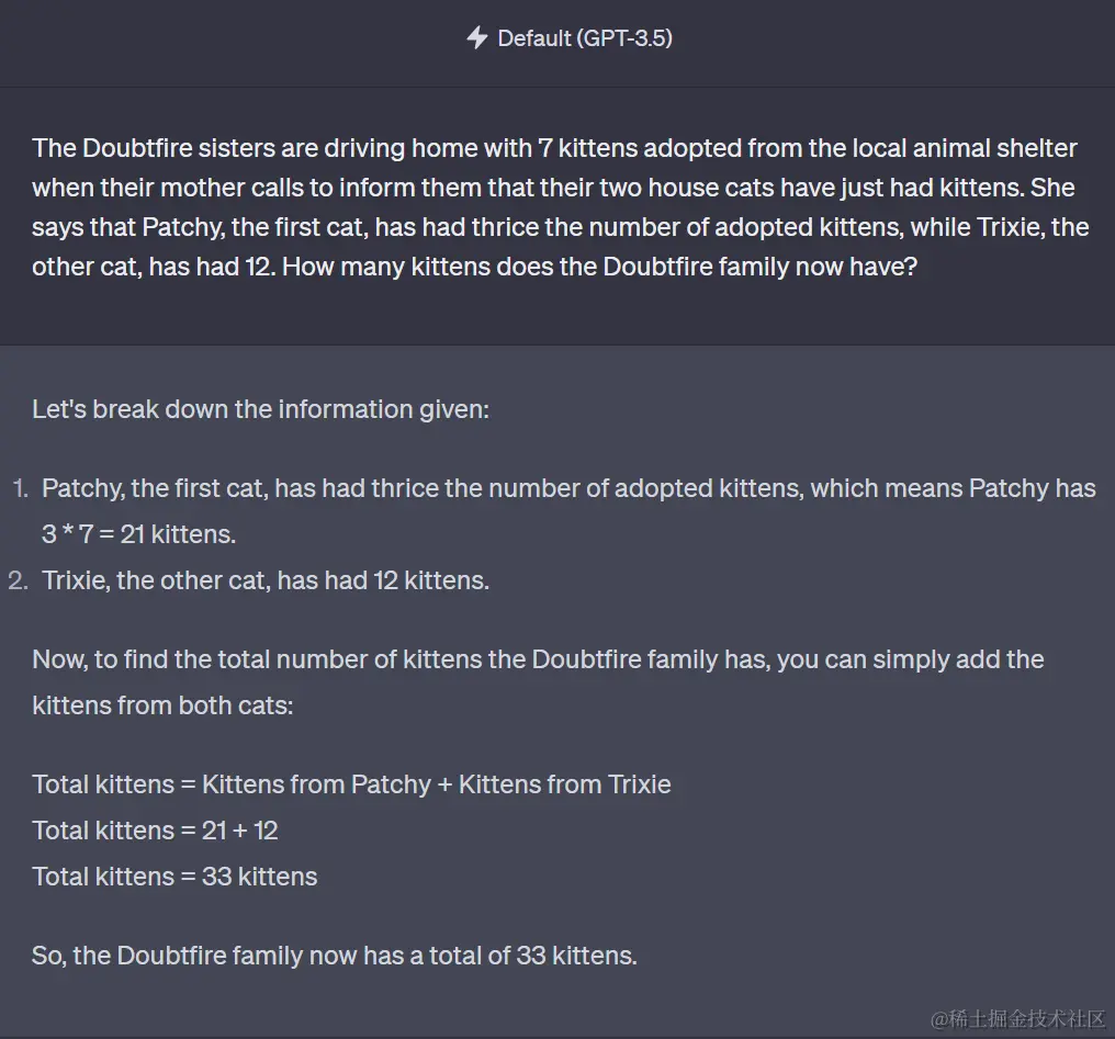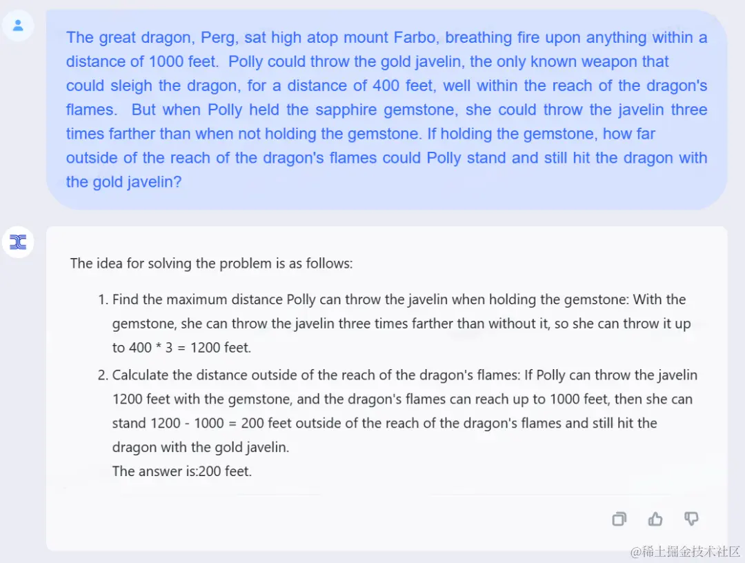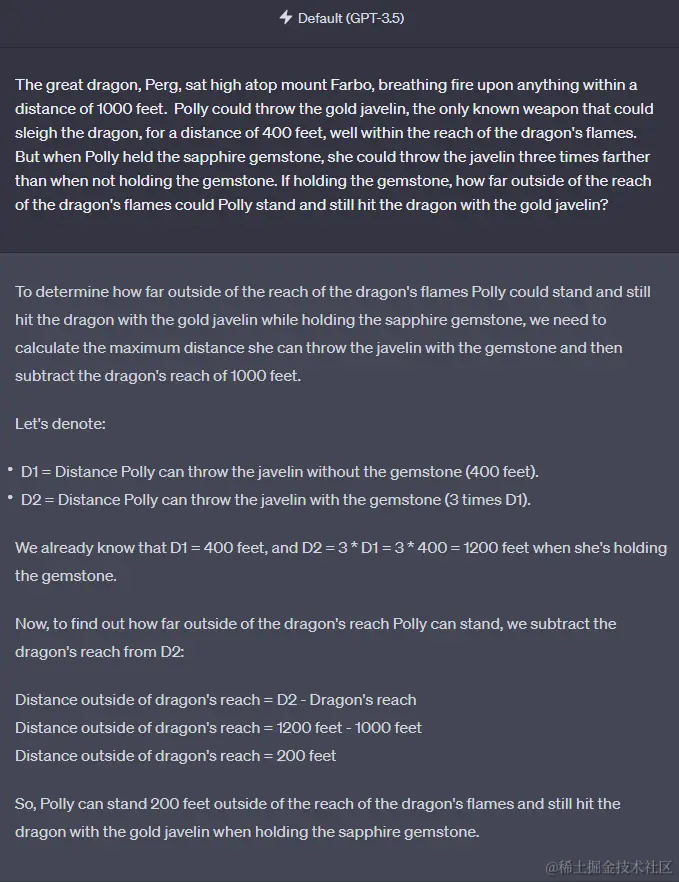 GPT-3.5 给出的解题思路也摆在这,最后答案也是 200 英尺。