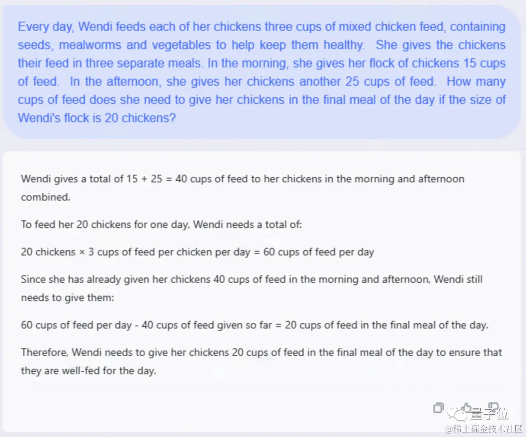 为了做个验证,按照惯例,天工大模型和 GPT-3.5 面临了来自 GSM8K 测试集的英文同题考验。