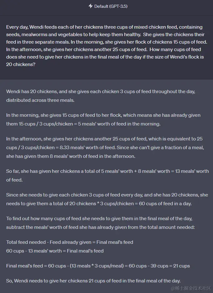 GPT-3.5 答,Wendi 需要在一天的最后一餐中给鸡崽子们喂 21 杯饲料。