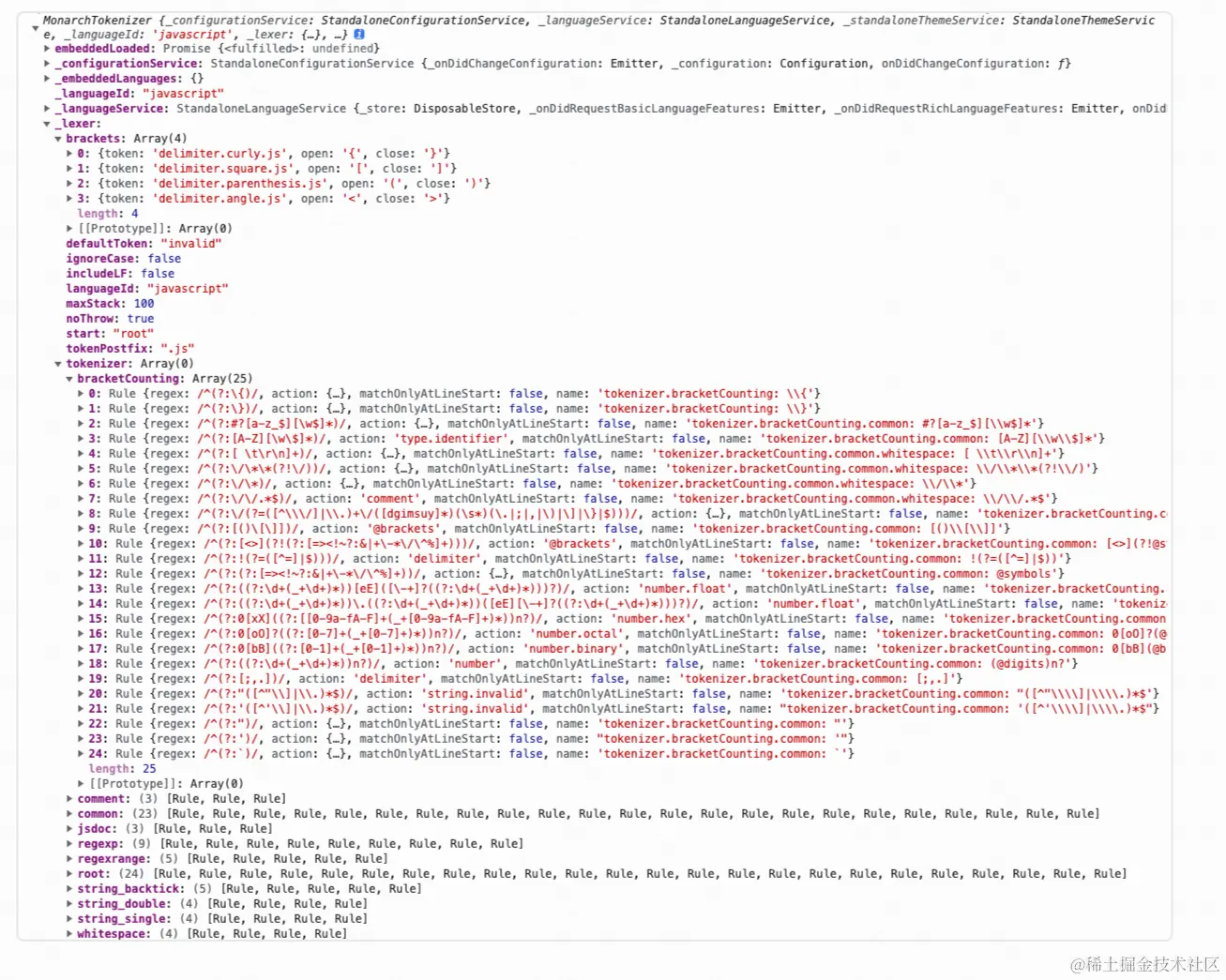 首先在编辑器实例初始化的时候,Monaco-Editor会生成一个TokenizationRegistry进行全局语言服务的处理,包括:handleChange(处理文本变化),factory(仓库)等信息。当一个语言服务被注册之后,会产生一个对应的MonarchTokenlizer,这里打印到控制台看一下具体的Tokenlize包含什么: