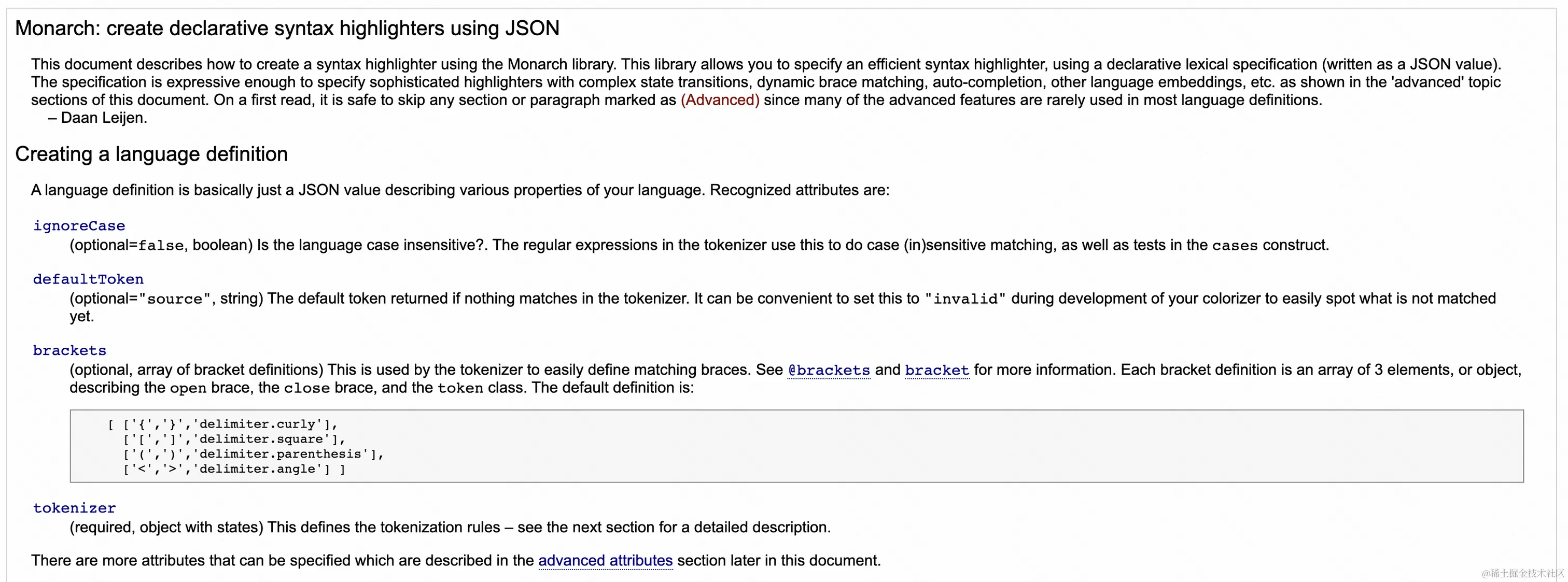 一个完整的Monarch可以实现的并不止有代码高亮的功能,还有自动补充字符(比如你输入一个左括号,会为你自动填充一个右括号),换行计算等,其中有一些核心概念用于定义语言的词法和语法规则。为了便于之后的理解,接下来我们将分析Monarch中的一个比较完整的示例,来了解其比较重要的核心概念。