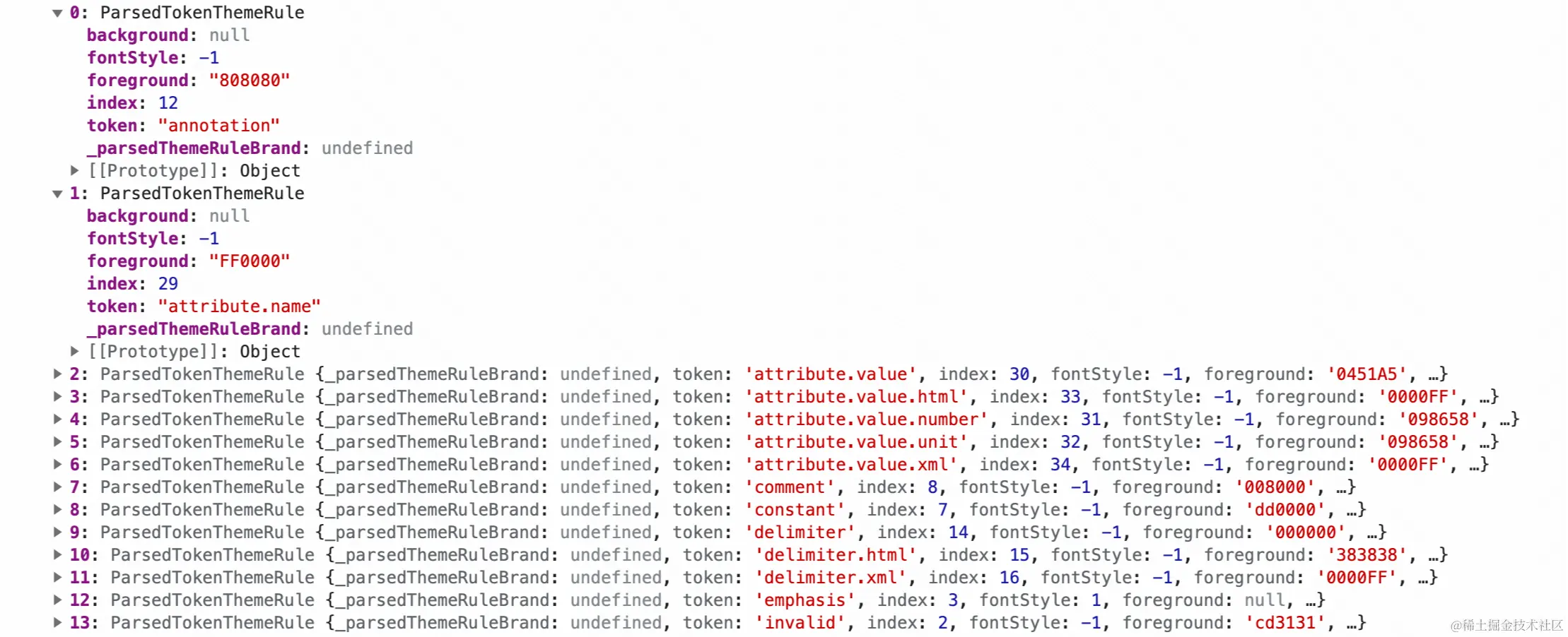 这个时候,再看一下token数组,是不是就有头绪了,3375210等数字就是将字体,前景色,背景颜色合在一起的数据。你可以将它理解为一个CSS中的类,表示某个token对应的样式。