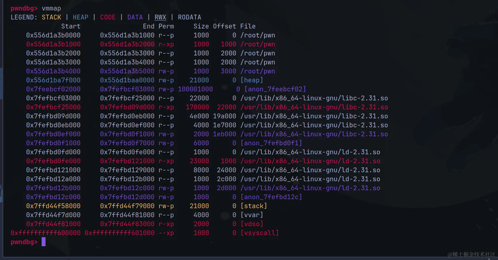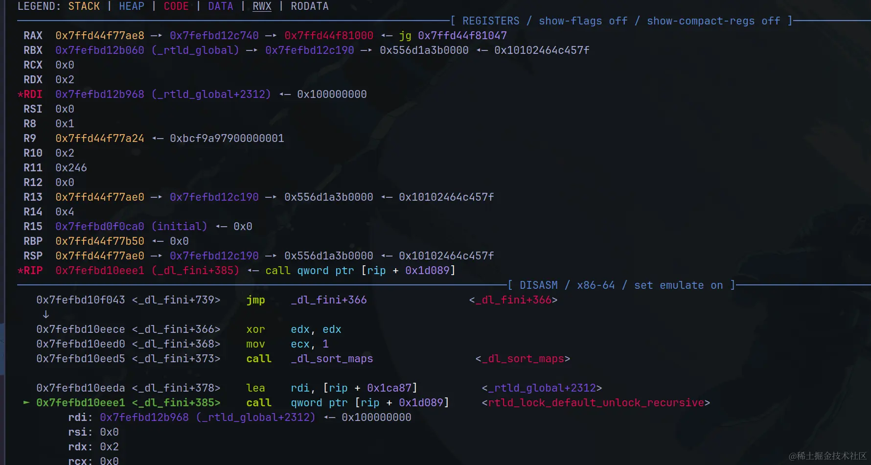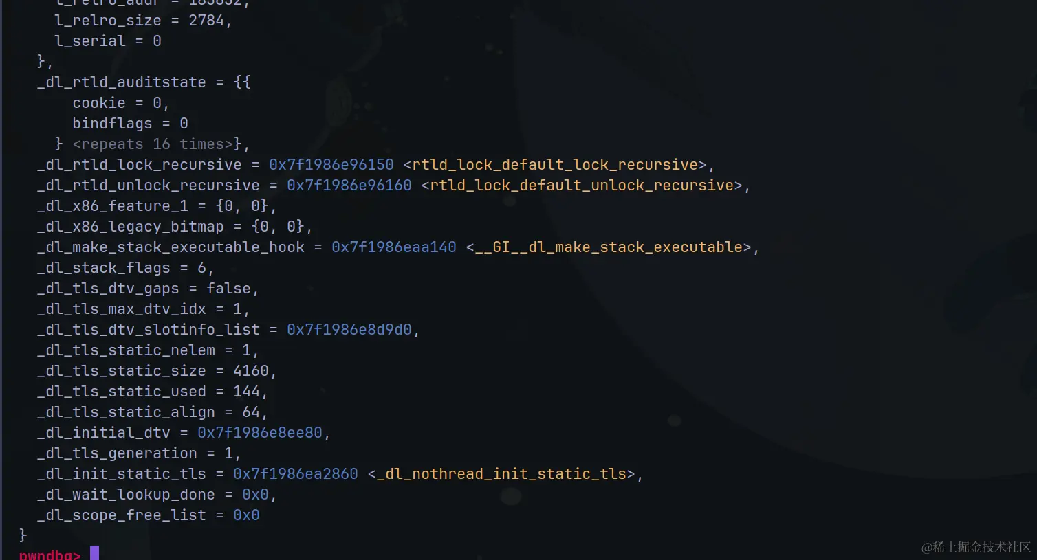 执行p _rtld_global。看到那两个rtld_lock_default_lock_recursive和rtld_lock_default_unlock_recursive吗,就是他们两个。我们可以修改他们的内容,从而作为exithook进行调用(直接call)。把后面的东西复制过来p &xxx就可以查看其地址了。
