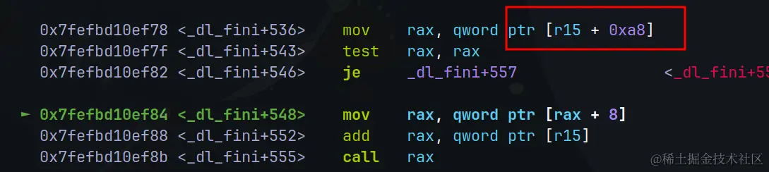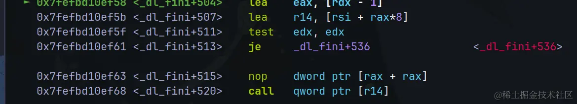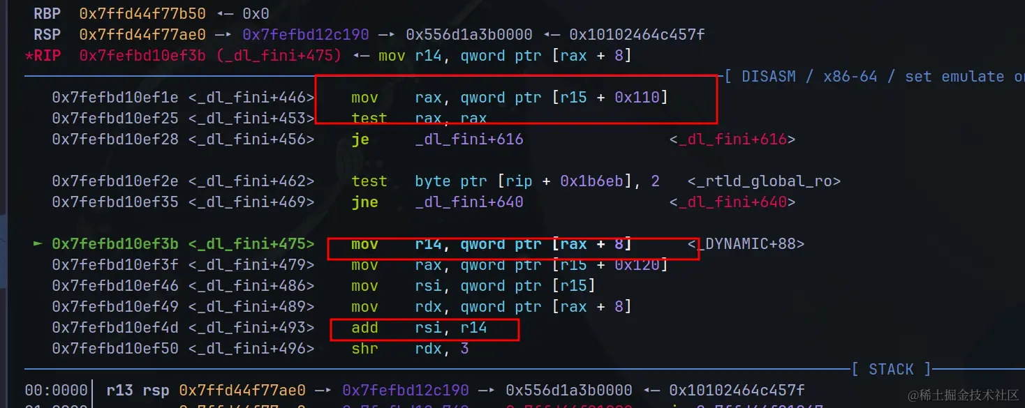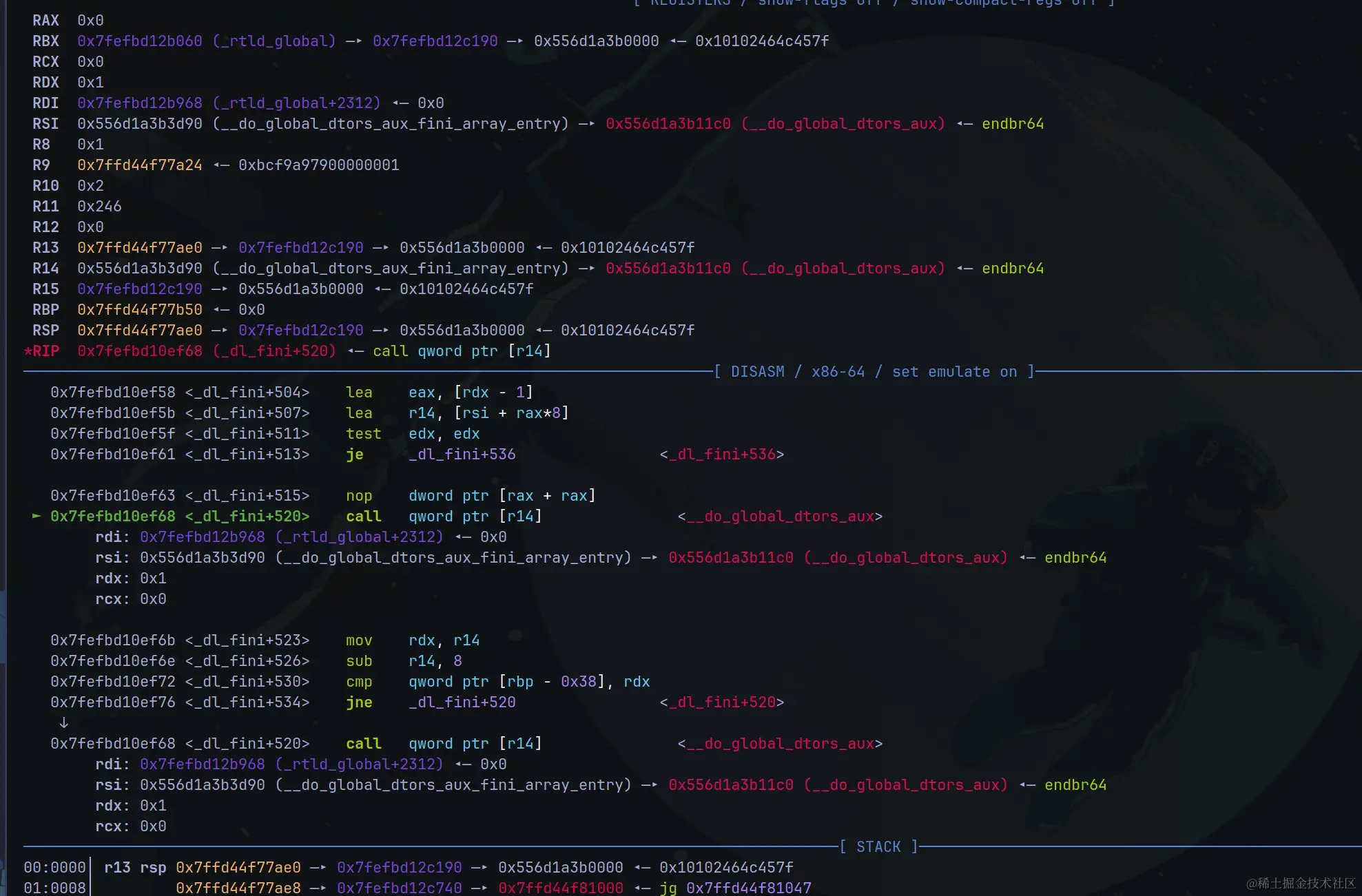 回溯发现是从link_map+0x120取来的地址,也就是说想要这里为0,就把那里的地址指向为0的地方即可!不过也要注意,这里取的是地址+8,也就是我们要改成目标地址-8改进去。这里直接找bss段之类的即可。