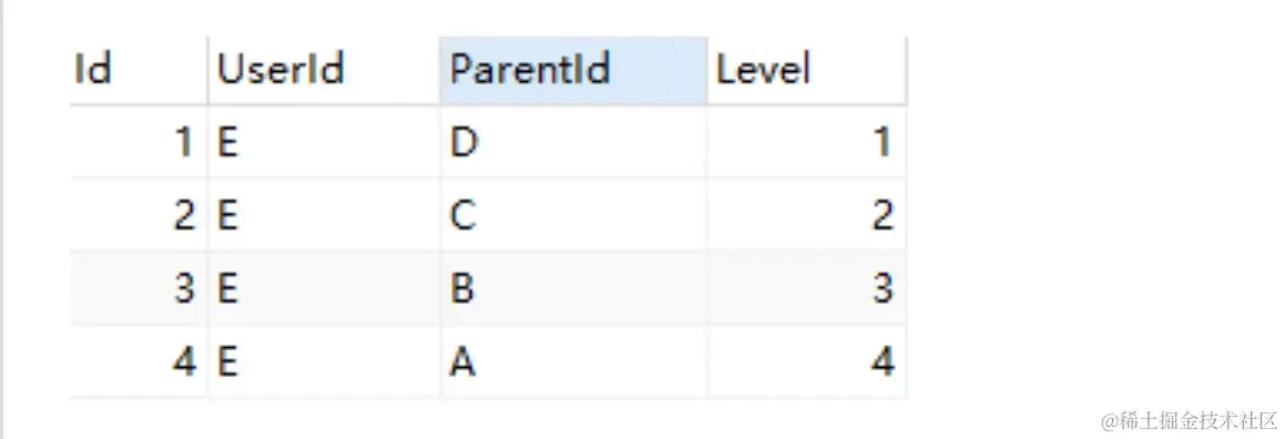 1.在注册的时候需要往这张表插入数据,比如D推荐E来注册,就需要往库里插入如下记录:
