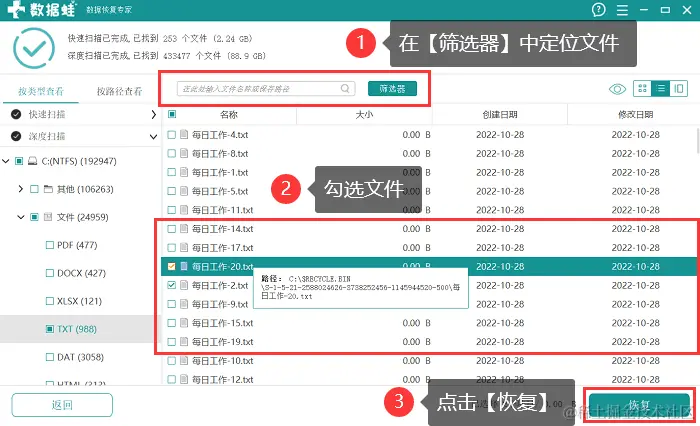 步骤4:深度扫描结束后,可以全面对需要恢复的文档进行选择,如果文件太多,建议使用 【筛选器】 ,选择完毕后,点击【恢复】。