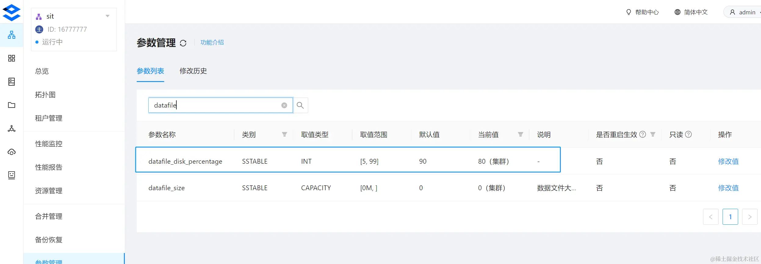 另外,datafile_disk_percentage 与 datafile_size 参数需要调大时,可以在集群中进行动态调整,不需要重启集群,调小则不效。