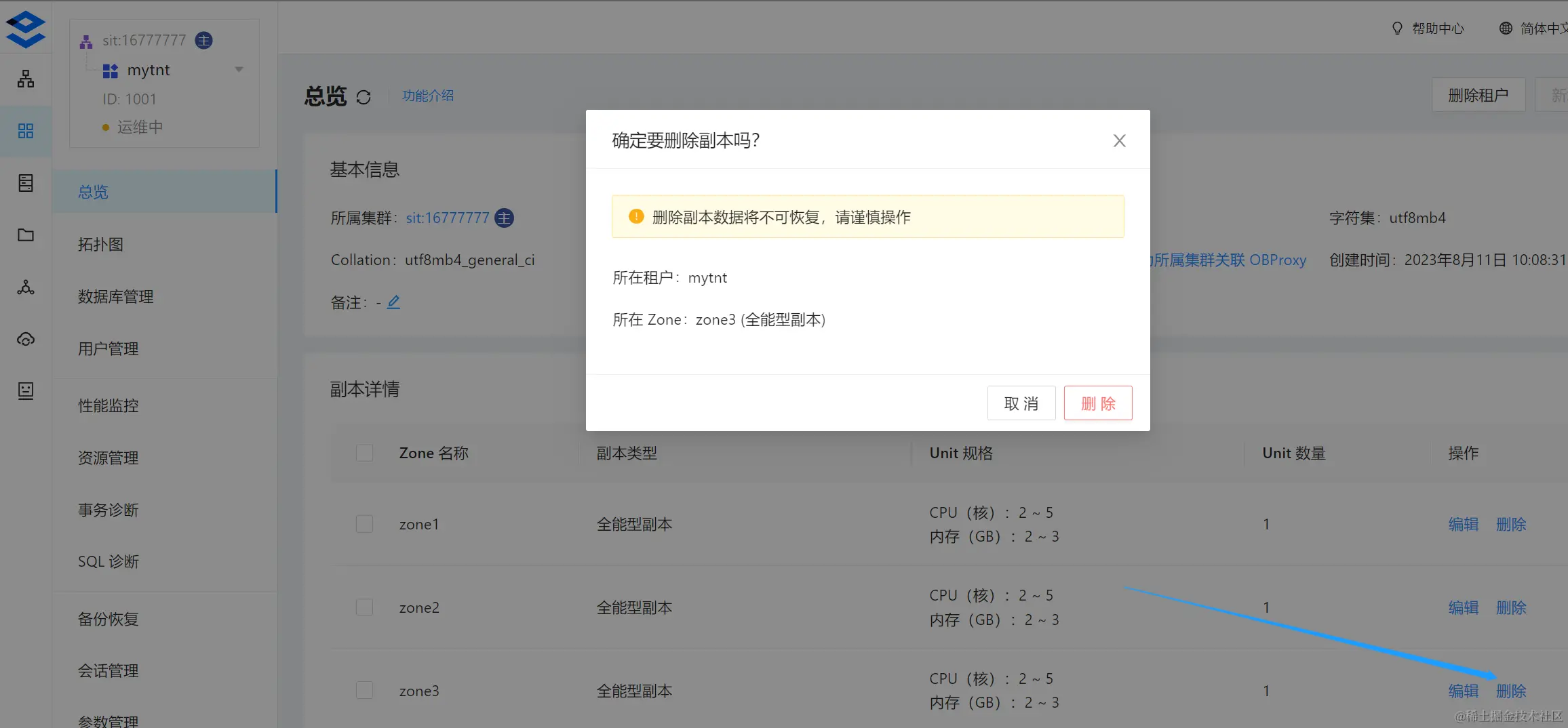 集群->租户管理,选择租户(包括 sys 租户)在副本详情中选中 zone 删除副本(例:zone3),等待任务结束。