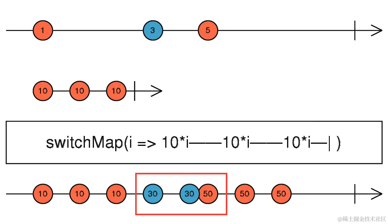 - 注意上面图中红色的30-30-30内部Observable:最后一个值30没有被发出,因为30-30-30内部Observable被取消订阅了