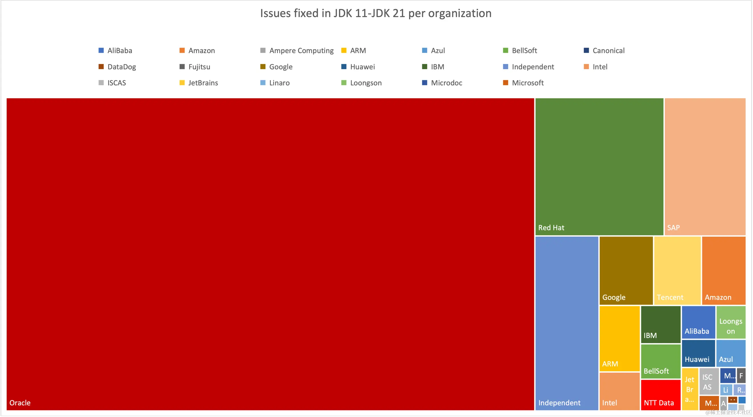 与以前的版本一样,Java 21由Oracle与OpenJDK 社区中许多个人和组织的贡献一起构建。Java在已修复的24,196个JIRA问题中,有17,288个由Oracle工作人员完成,而6,908个由其他组织工作人员或个人开发者贡献。通过查看问题并从受让人那里收集组织数据,得到以下图表,显示了在Java中赞助贡献开发的组织: