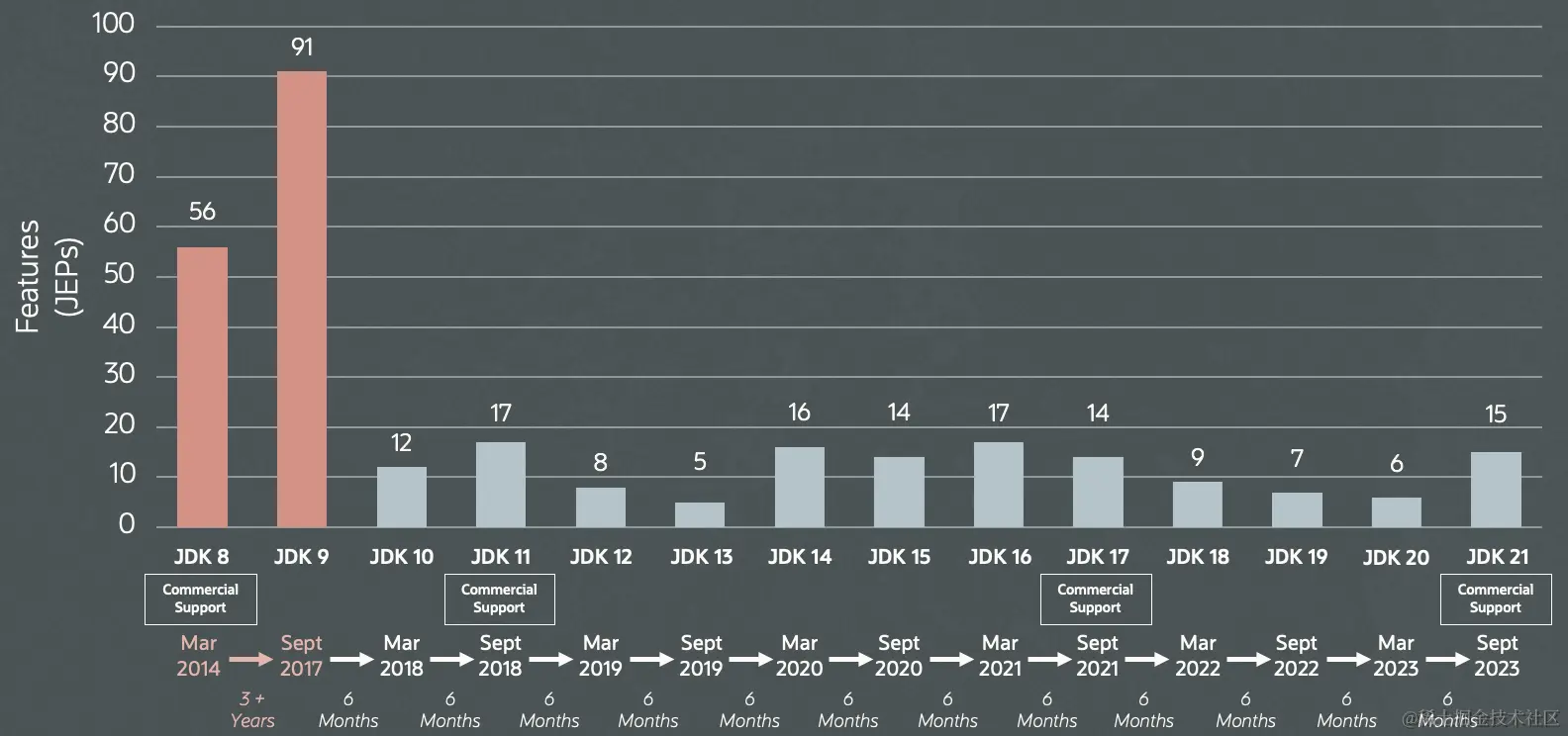 图表显示自Java 8以来每个版本的功能数量 Java的性能、稳定性和安全性的提升,使其继续成为世界上最受欢迎的编程语言。
