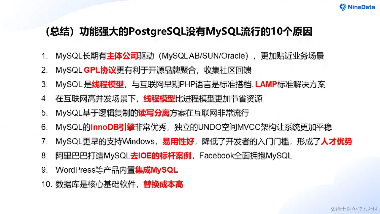 数据库是非常核心的基础软件,生产使用后替换的成本很高,即使现在看PostgreSQL在功能上更领先,但是在稳定性方面没有得到大规模的验证、人才储备不足的情况下,要替换现有系统是高风险的事情。Uber曾经就因为使用PostgreSQL遇到很多问题,然后全部迁移到MySQL。