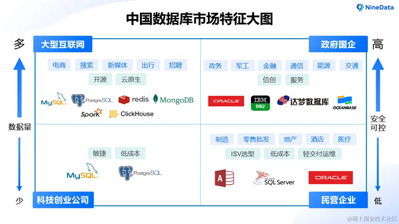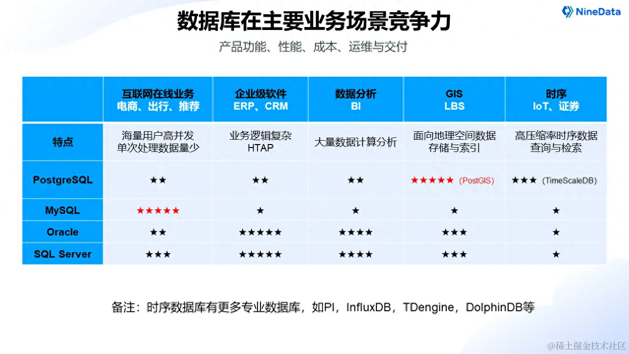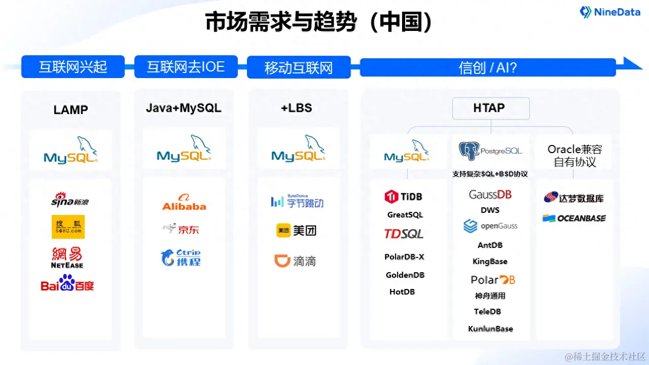 PostgreSQL已经错失了互联网机遇,不过它支持更复杂的SQL,HTAP能力也更加出色,适合应用于企业级软件领域(ERP、CRM、BOSS等等)。但随着中国的信创产业发展迅速,PostgreSQL宽松的BSD开源协议,很多厂商基于PostgreSQL发展出了新型国产数据库,提供更好的服务支持,信创涉及到大量系统替换,这可能会是PostgreSQL在中国迎来新的发展机会。另外PostgreSQL的pgVector插件可以支持基础的向量数据库功能,在赶上了今天ChatGPT引领的大模型AI时代风口。
