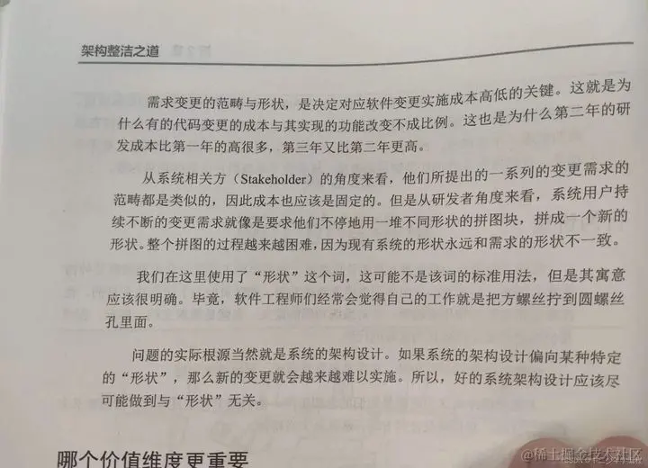 为了达到软件的本来目的,软件系统必须够“软”——也就是说,软件应该容易被修改。当需求方改变需求的时候,随之所需的软件变更必须可以简单而方便地实现。变更实施的难度应该和变更的范畴成等比关系,而与变更的具体形状无关。 需求变更的范畴与形状,是决定对应软件变更实施成本高低的关键。这就是为什么有的代码变更的成本与其实现的功能改变不成比例。 从系统相关方的角度来看,他们所提出的一系列的变更需求的范畴都是类似的,因此成本也应该是固定的。但是从研发者角度来看,系统用户持续不断的变更需求就像是要求他们不停地用一堆不同形状的拼图块,拼成一个新的形状。整个拼图的过程越来越困难,因为现有系统的形状永远和需求的形状不一致。 问题的实际根源当然就是系统的架构设计。如果系统的架构设计偏向某种特定的形状,那么新的变更就会越来越难以实施。所以,好的系统架构设计应该尽可能做到与“形状”无关。