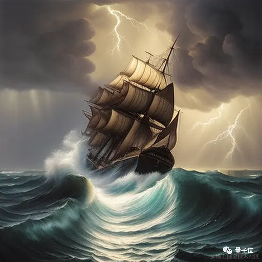 Romantic painting of a ship sailing in a stormy sea, with dramatic lighting and powerful waves