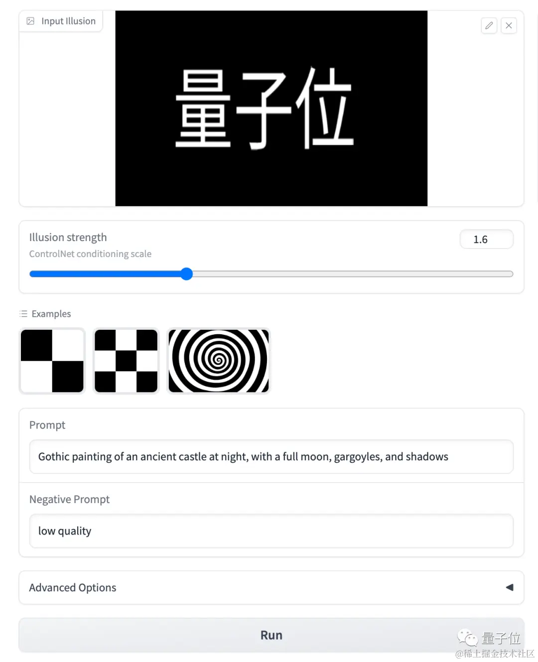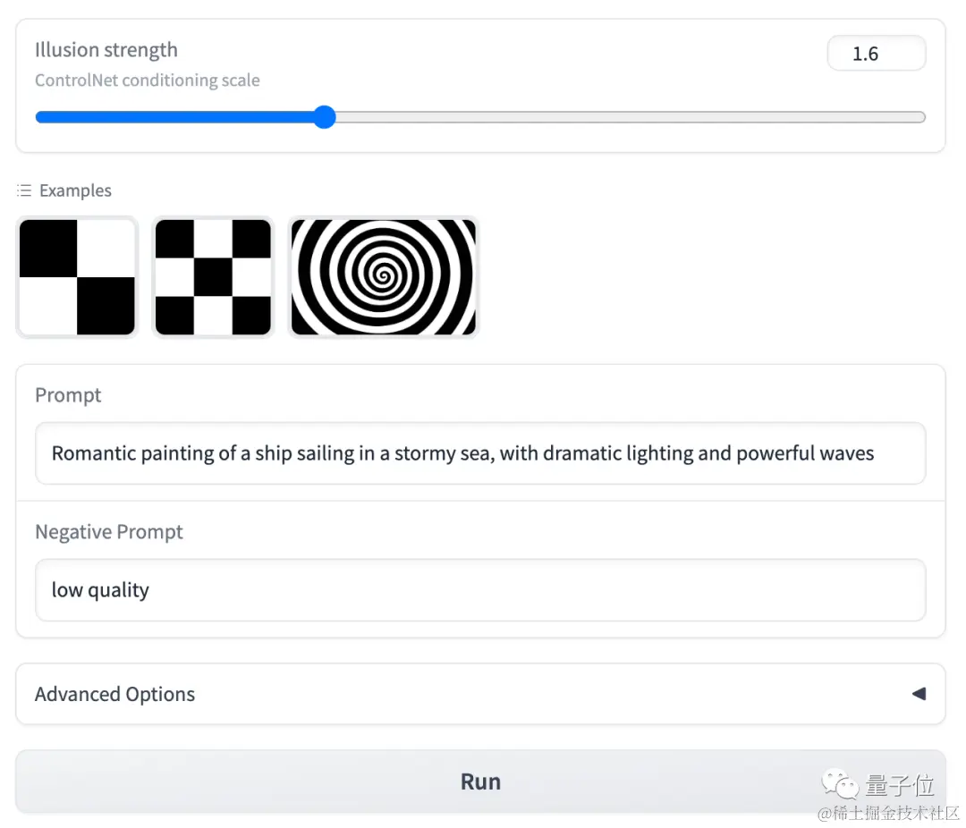 在线Demo提前准备了三款底图模板:四格棋盘、9格棋盘和螺旋。接下来输入提示词,调整底图的强度,直接生成即可,实测下来螺旋底图强度用默认的0.8就可以,棋盘底图需要拉高一些,1.5-2之间比较合适。