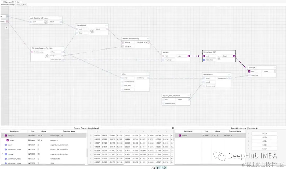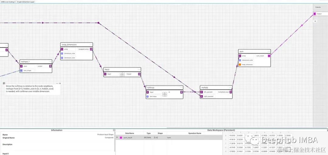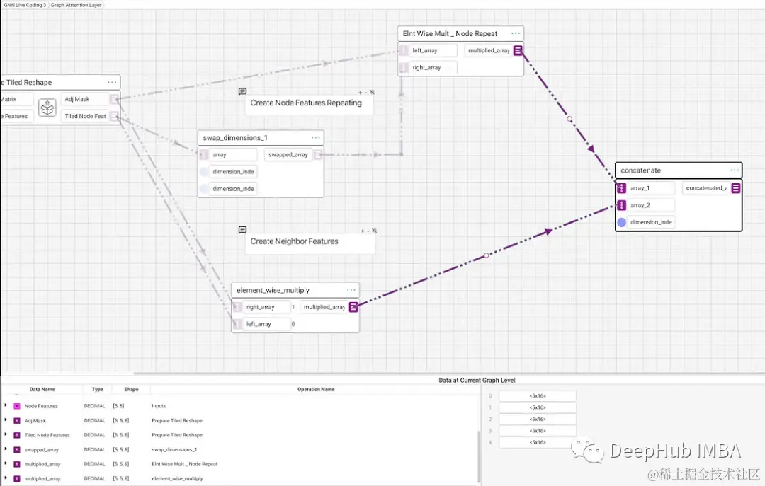 因为不能直接将节点特征从[5,8]广播到[5,5,8],我们必须首先广播到[25,8],因为在广播时,形状中的每个维度都必须大于或等于原始维度。所以得到形状的5和8部分(get_sub_arrays),然后乘以第一部分得到25,然后将它们全部连接在一起。将结果[25,8]重塑回[5,5,8],结果可以在Graphbook中验证最终2维中的每个节点特征集是相同的。