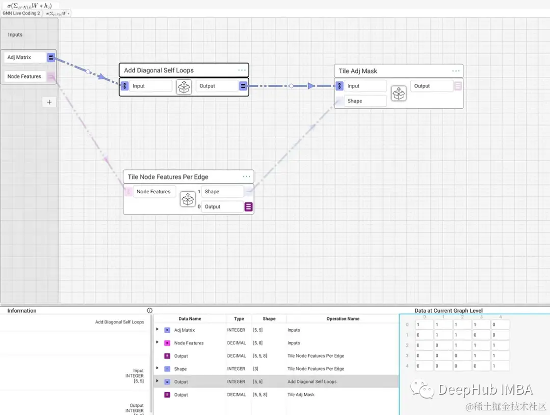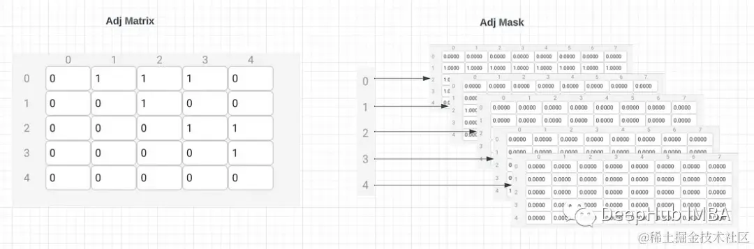 这里的实现非常简单,只需将邻接矩阵解析为十进制并从[5,5]形状广播到[5,5,8]。将这个邻接掩码与平铺节点邻居特征相乘。