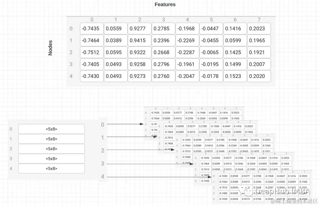 我们将节点特征平铺(即广播)为3D形状,也就初始的[5,8]形状的节点特征,扩展成有[5,5,8]形状,其中第0维的每个单元格都是节点特征的重复。所以现在可以把最后一个维度看作是“邻居”特征。每个节点有5个可能的邻居。