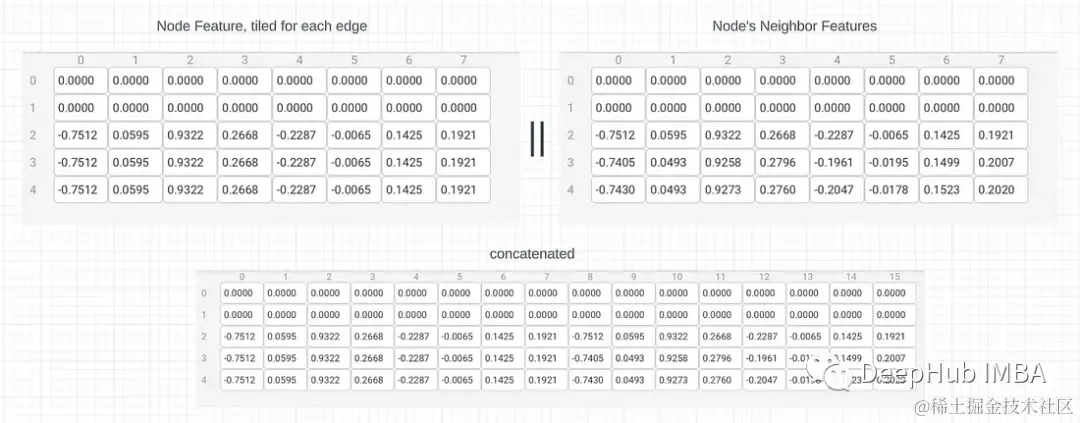 这用结果仍然是一个[5,5,8]形数组,但现在[i,:,:]中的每一行都是相同的,并且对应于节点i的特征。然后我们就可以使用乘法来创建只在包含邻居时才重复的节点特征。最后就是将其与上面的GNN创建的相邻特征连接起来,生成连接的特征。