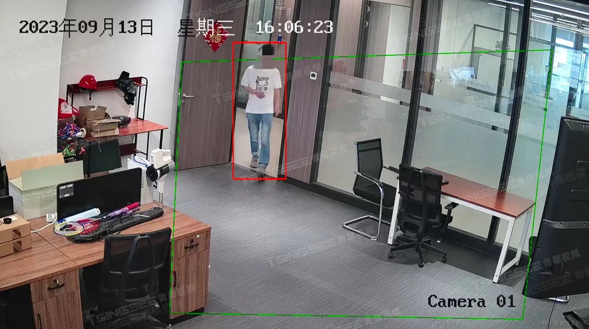 7)危险区域人员入侵检测:当检测到工厂配电房、大型生产机械等危险区域有人员闯入时,自动触发报警,并可联动现场语音设备提醒闯入人员离开。