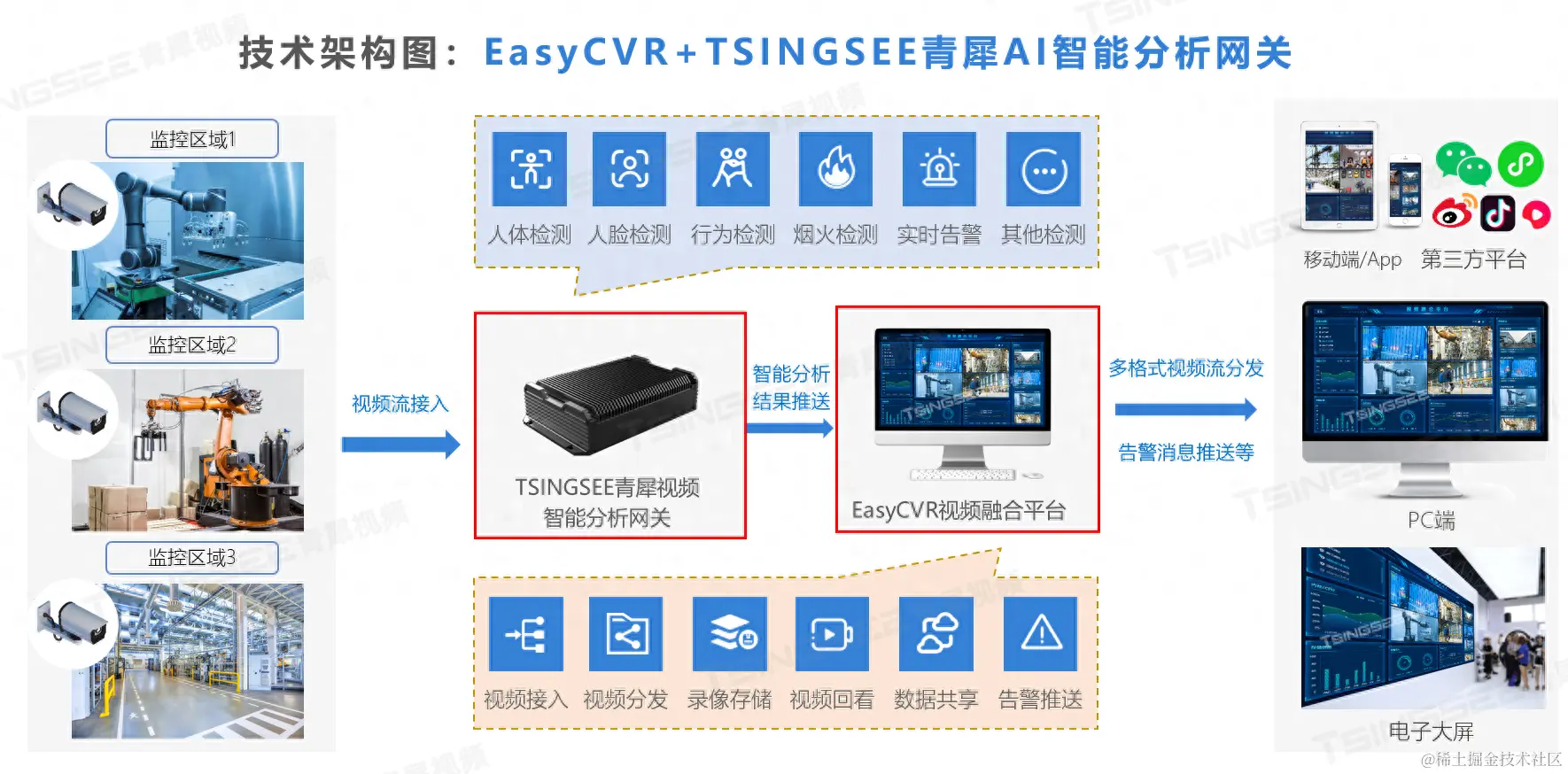 在生产线车间内部署高清监控摄像头并统一接入到安防监控系统EasyCVR视频汇聚平台,同时基于摄像头采集的视频流,利用TSINGSEE青犀视频AI智能分析网关内部署的AI算法模型,对视频流进行实时检测与分析,通过对生产车间的人,物、行为进行抓拍、检测与识别,对异常情况进行智能提醒和通知,实现对生产车间的智能化、数字化、信息化监管。