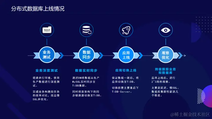 - 数据库迁移前,旧有的 MySQL 体系主要遇到的问题是大表 DDL 耗时、分库分表耗费大量人力、单节点写入易出现瓶颈等问题,最后通过分布式数据库 TiDB 解决了上述问题;