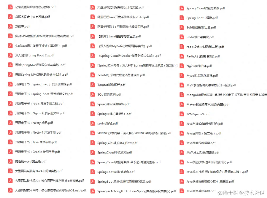 这套题库里面中包含了以下很多个模块:并发编程,多线程,集合框架,设计模式,数据库,性能优化,RabbitMQ消息中间件,ActiveMQ消息中间件,Dubbo,JVM,Kafka,MongoDB,MyBatis,MySQL,Netty,Nginx,Redis,Tomcat,Zookeeper,Spring,SpringBoot,SpringCloud,SpringMVC,.......