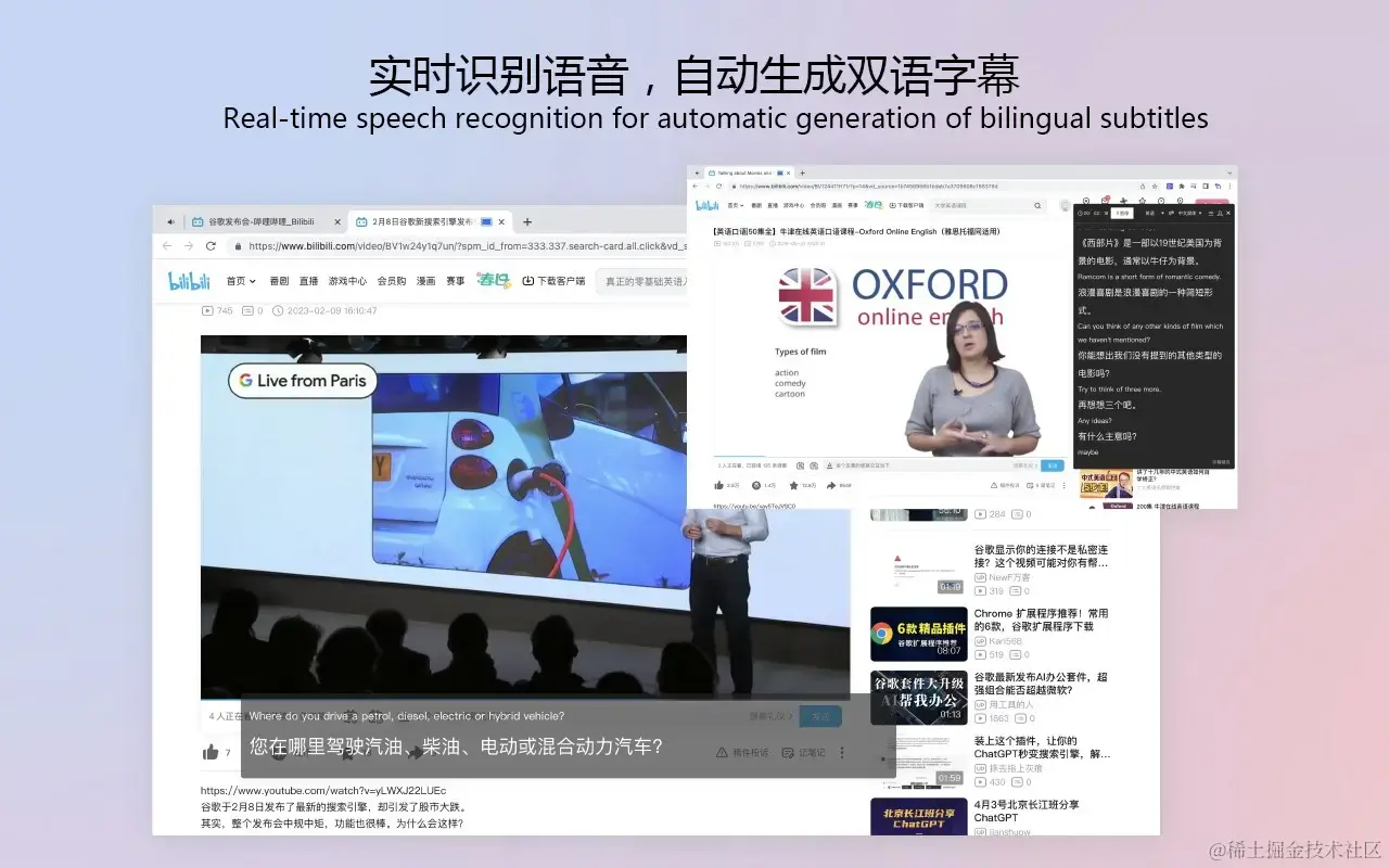 - 视频浏览:实时双语翻译字幕,英文视频随心看,信息获取更高效