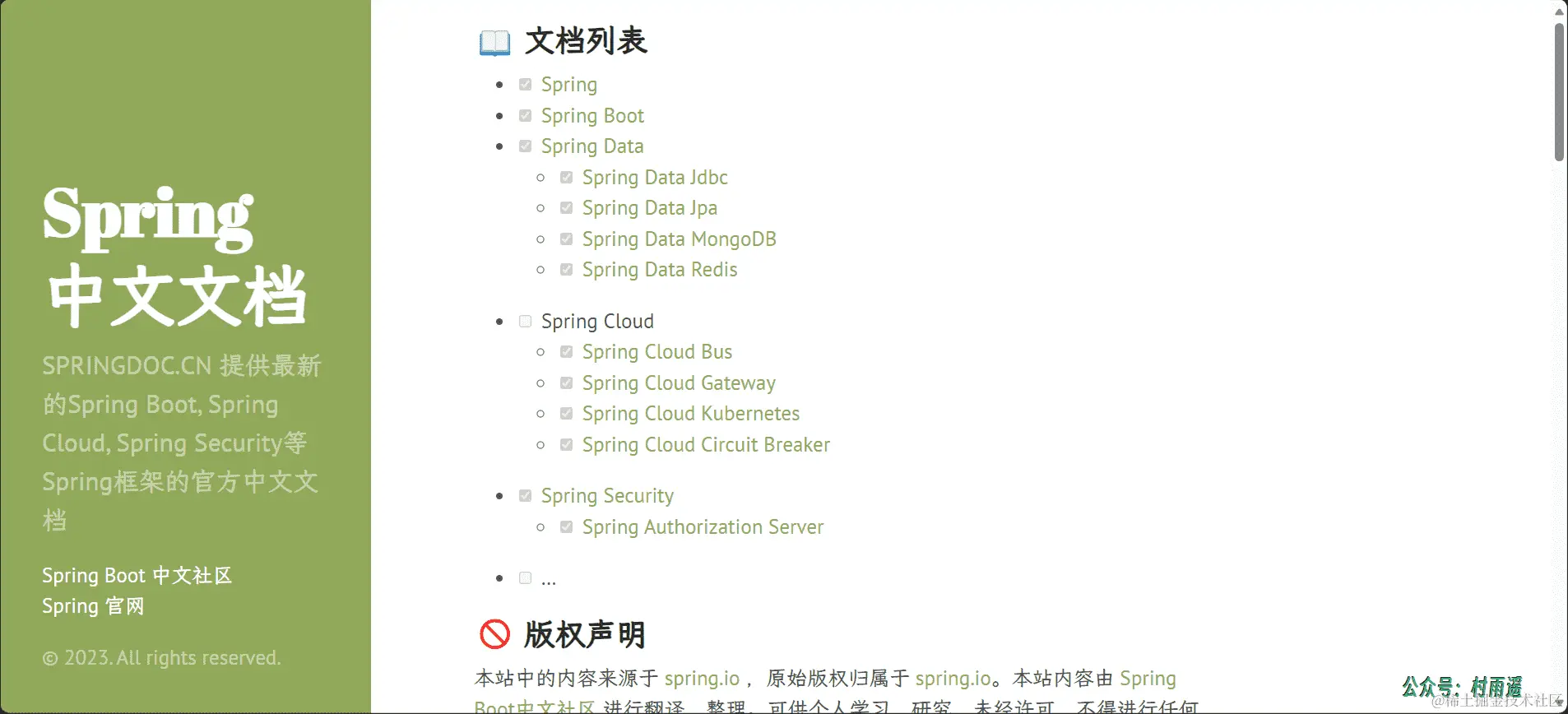 提供最新的 Spring Boot, Spring Cloud, Spring Security 等 Spring 框架的官方中文文档。对于想及时追踪 Spring 最新更新,但英语基础不太好的同学是一个绝佳的选择。
