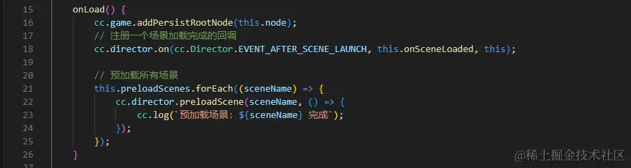 onLoad初始化,把场景管理器的节点设置成一直存在cc.game.addPersistRootNode(this.node);在切换场景时不会被销毁。同时监听场景加载完成回调和预加载需要提前加载的场景。