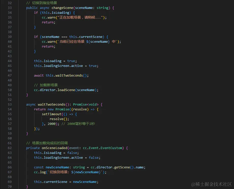 核心接口是cc.director.loadScene(sceneName),用于加载新场景。其中waitTwoSeconds只是做个演示效果延时秒,没有其他实际用途。