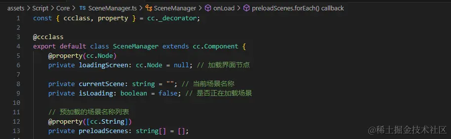 声明SceneManager,继承cc.Component。包含loading图节点,和预加载的场景列表。