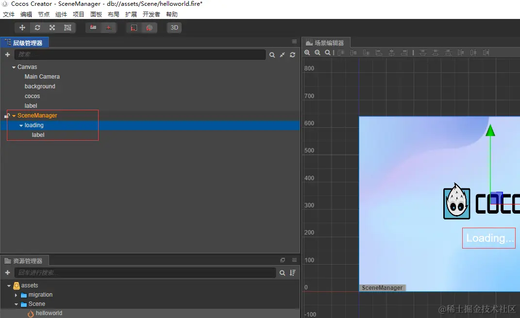 新增一个SceneManager节点,并且在它下面添加一个loading图和loading标签。